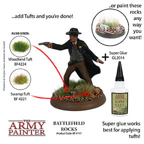 Use Battlefield Rocks for smaller stones, giving a perfect texture on especially larger bases - to break the even look. Highly realistic look!