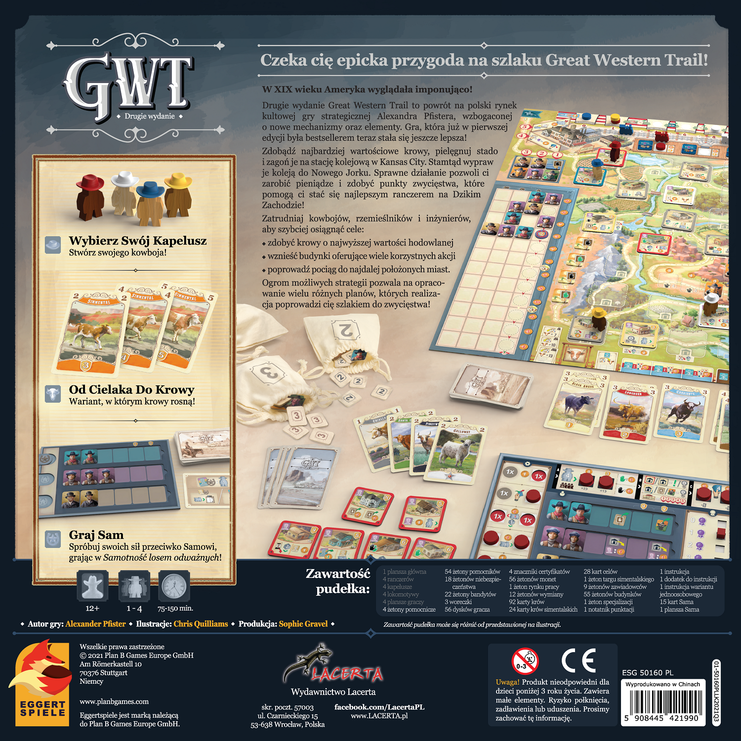 Drugie wydanie Great Western Trail to powrót na polski rynek kultowej gry strategicznej Alexandra Pfistera, wzbogaconej o nowe mechanizmy oraz elementy. Gra, która już w pierwszej edycji była bestsellerem teraz stała się jeszcze lepsza!
