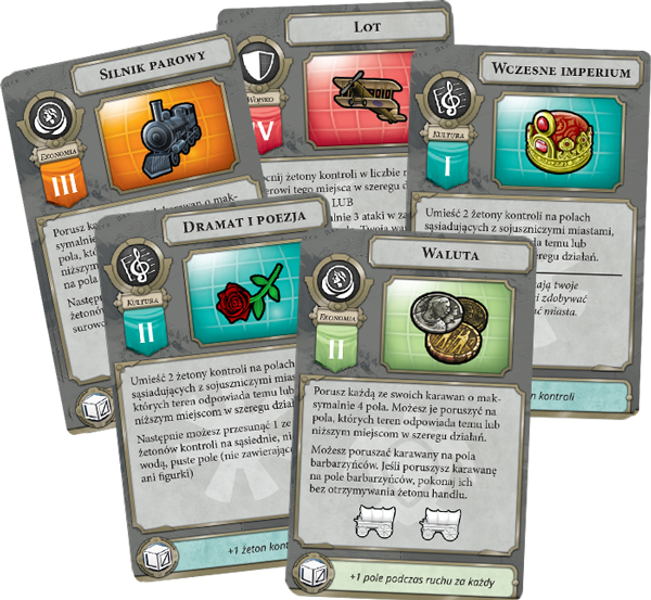 Postęp ekonomiczny pozwala na interakcję z miastami-państwami oraz wrogimi miastami poprzez poruszanie karawan, a miejsce karty działania w szeregu określa na jakie rodzaje terenu mogą poruszyć się karawany. Rozwój przemysłu będzie niezbędny, aby założyć nowe miasto lub wznieść cud świata, a gracze, którzy chcą skupić się na podbojach i walce skupią się na kartach z dziedziny wojskowości.
