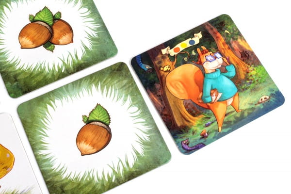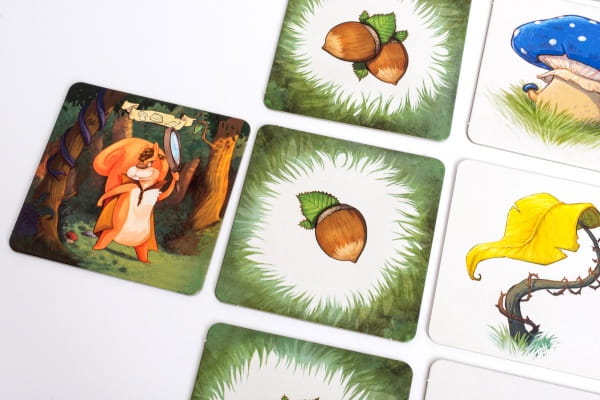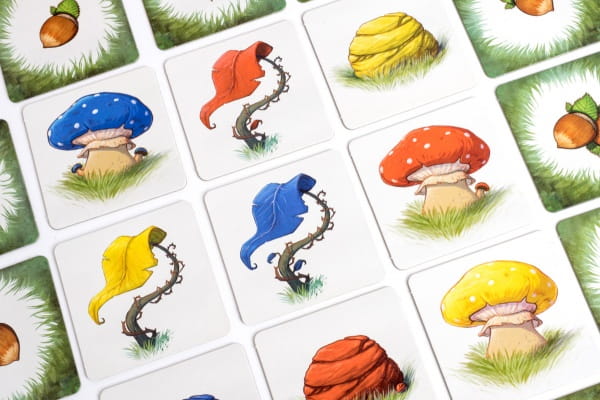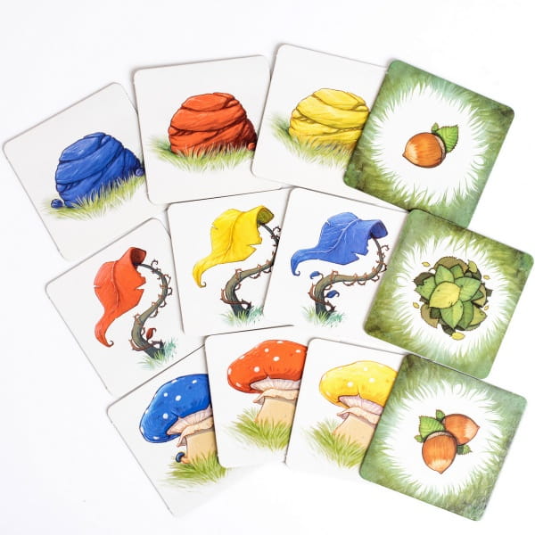 - 9 kafli lasu (dwustronnych) - na obu stronach znajduje się obiekt (grzyb, liść albo kamień) w kolorze żółtym, czerwonym albo niebieskim.