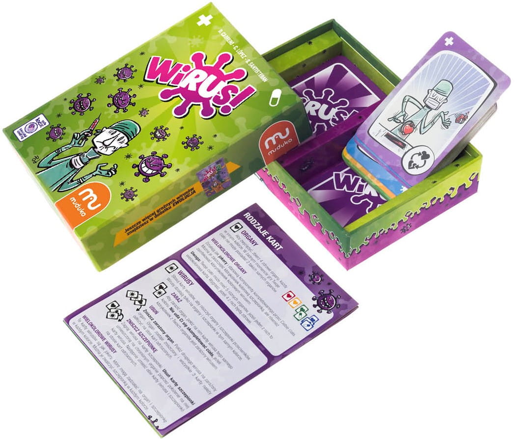 Wirus! to szybka gra imprzowa dla 2 do 6 osób, w której będziecie musieli zbudować ludzkie ciało, jednocześnie bronić je przed zainfekowaniem, zniszczeniem lub kradzieżą organów przez zarażonych przeciwników.